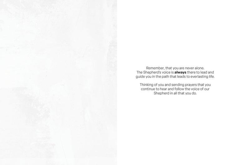 Remember, that you are never alone. The Shepherd's voice is always there to lead and guide you in the path that leads to everlasting life. Thinking of you and sending prayers that you continue to hear and follow the voice of our Shepherd in all that you do.
