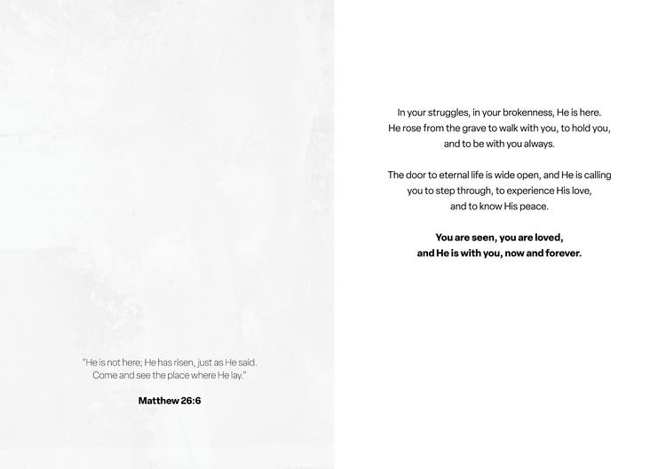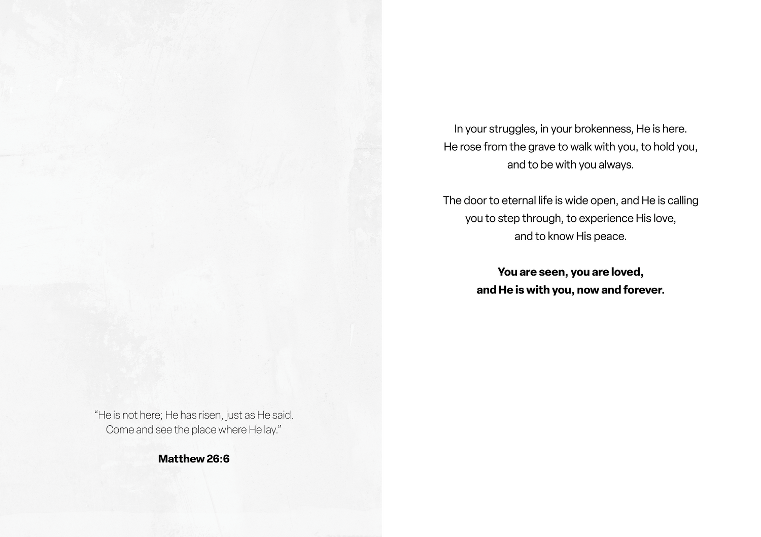 In your struggles, in your brokenness, He is here. He rose from the grave to walk with you, to hold you, and to be with you always.