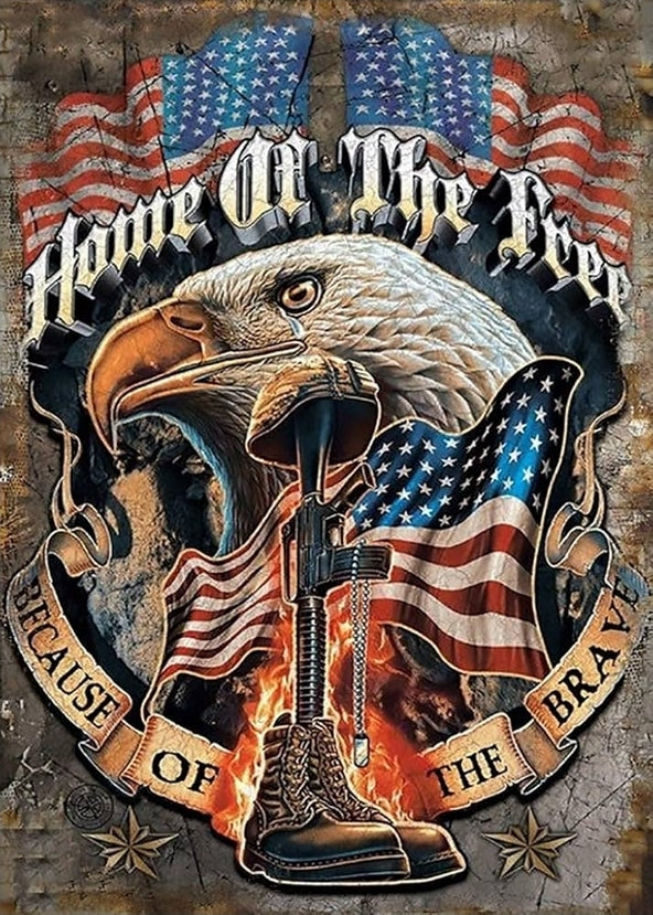 Honor the bravery behind freedom with our "Home of the Free" design, featuring an eagle soaring over the American flag alongside combat boots, a helmet, and a gun. This powerful imagery pays tribute to the sacrifices made by those who serve, making it a meaningful choice for veterans, active military members, and supporters alike. Crafted to inspire pride, it is perfect for commemorations, patriotic events, or everyday recognition of courage and sacrifice.