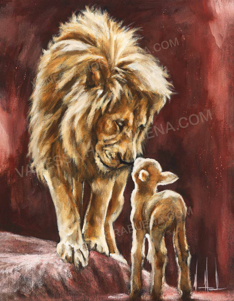 I have loved lions since I was a child. Every Wednesday night I would watch Wild Discovery and be enthralled by their majestic beauty. But anyone who has watched a Lion documentary, knows it’s not always pretty. These are fierce predator animals at the top of the food chain, and all others steer clear of their awesome power. Hunting is a huge focus of their footage. And it can be very hard to watch. But without going into more detail, that’s what’s so beautiful about this depiction here; the lion and the lamb.